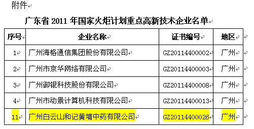 白云山和黃榮膺2011年國(guó)家火炬計(jì)劃重點(diǎn)高新技術(shù)企業(yè)