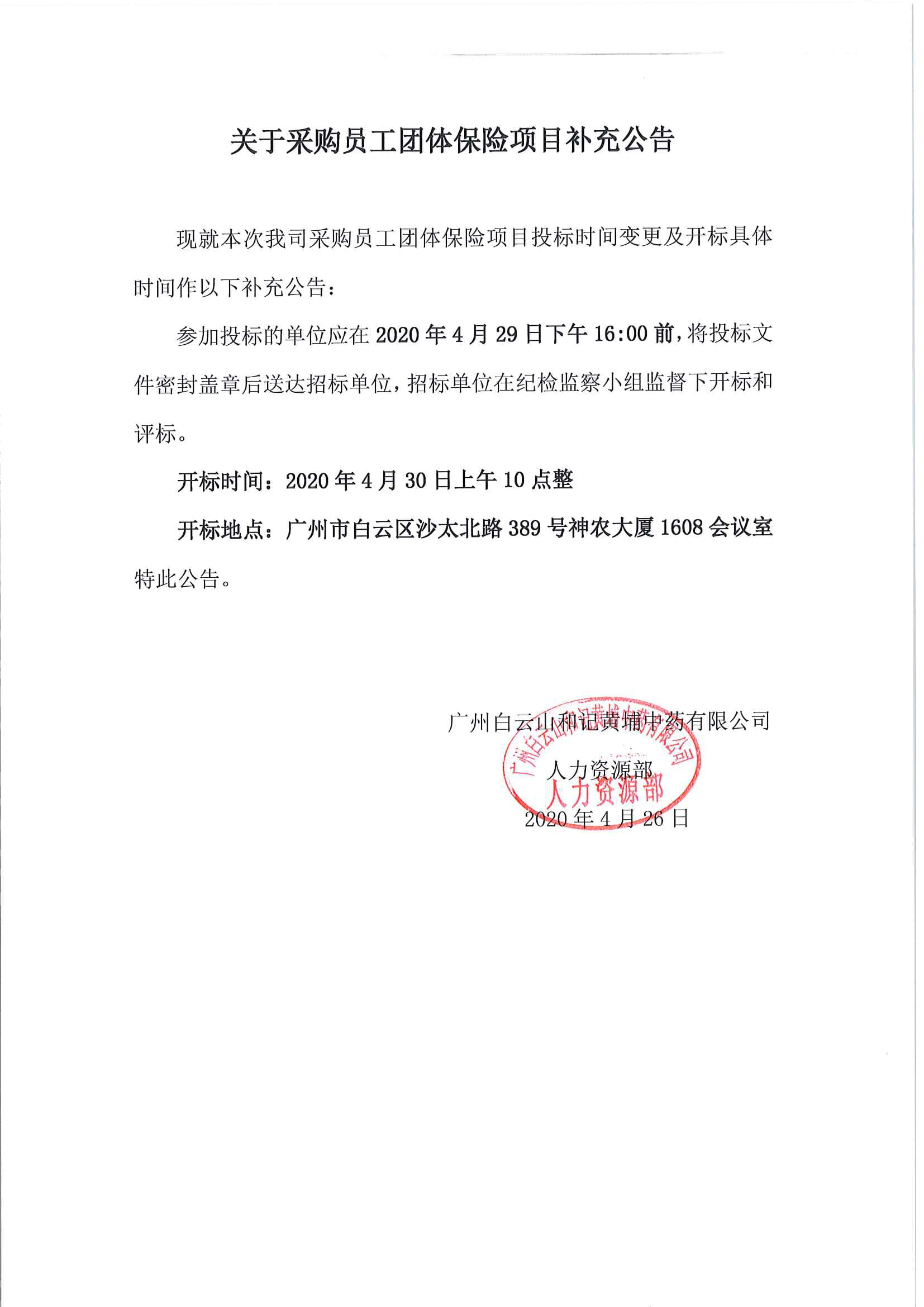 1、 由廣州白云山和記黃埔中藥有限公司員工意外險招標小組進行集中開標。開標地點:廣州市白云區(qū)沙太北路389號神農(nóng)大廈;